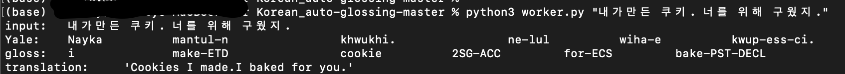 Korean auto-glossing 설치는 간단합니다. 특히 konlpy를 사용해보신 적 있으면 Step 3과 Step 4만 하면 되기 때문에 더 간단합니다.
