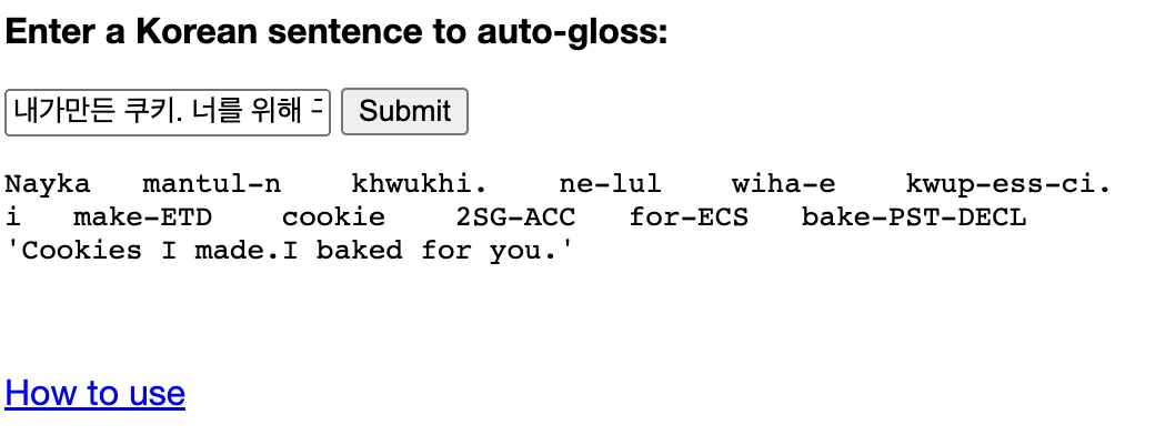 저는 구글에 interlinear gloss generator로 검색하니 이게 나와서 거기에 입력해봤습니다. 아래는 그 결과입니다.