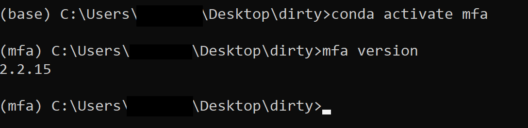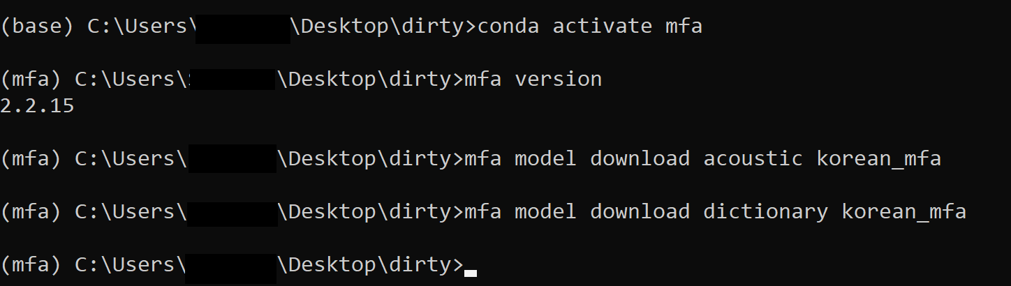 만약 맨 위에 conda create command에서 mfa 대신 다른 명칭을 사용했으면 (예: my_mfa), conda activate 에서도 그 명칭을 사용해준다. conda activate my_mfa 이렇게.