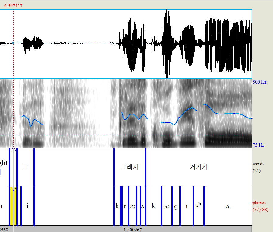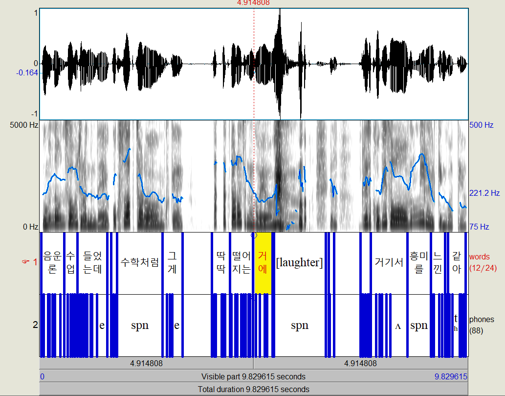 그리고 phones tier를 보면 각각의 어절을 phone단위로 나눠놨는데, 가끔씩 spn이 보인다. spn은 "웃음" 등 당연히 말소리가 아닌 부분에도 있지만, "수학처럼" 이나 "흥미를"처럼 발음사전에 등재되어 있지 않은 단어들도 해당한다.