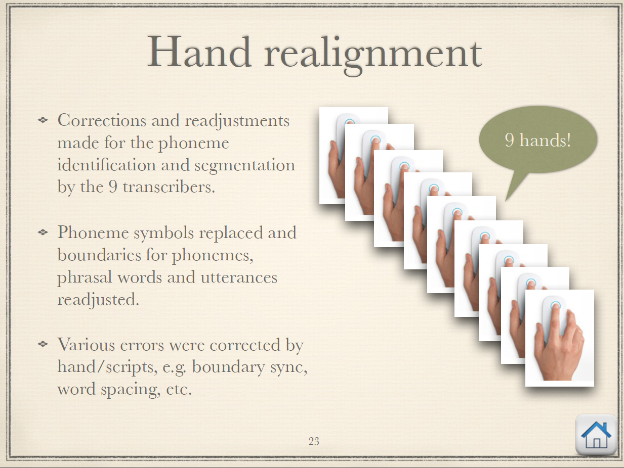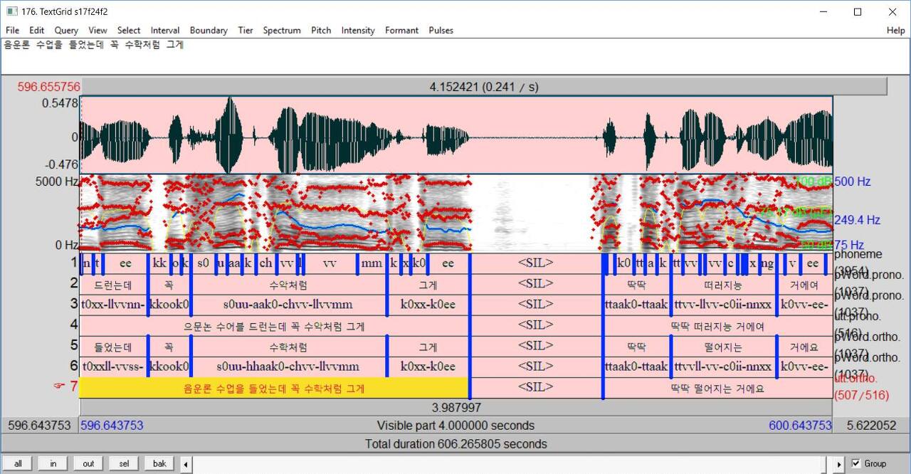 이 음성파일은 자연발화 말뭉치인 서울코퍼스의 일부인데, 9명의 연구원들이 직접 손으로 확인했다고 한다. (물론 2015년 역시 우가우가 시대가 아니기에 forced aligned된 결과를 realign함.)