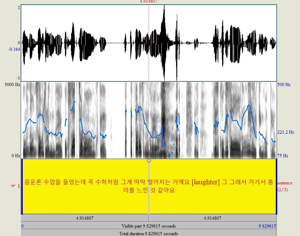 음성녹음만 있어서는 안되고, 그것을 praat으로 annotation부터 해야한다. 그리고 그 annotation을 기반으로 음향분석을 할 수 있다. annotation은 아래와 같은 걸 말한다.