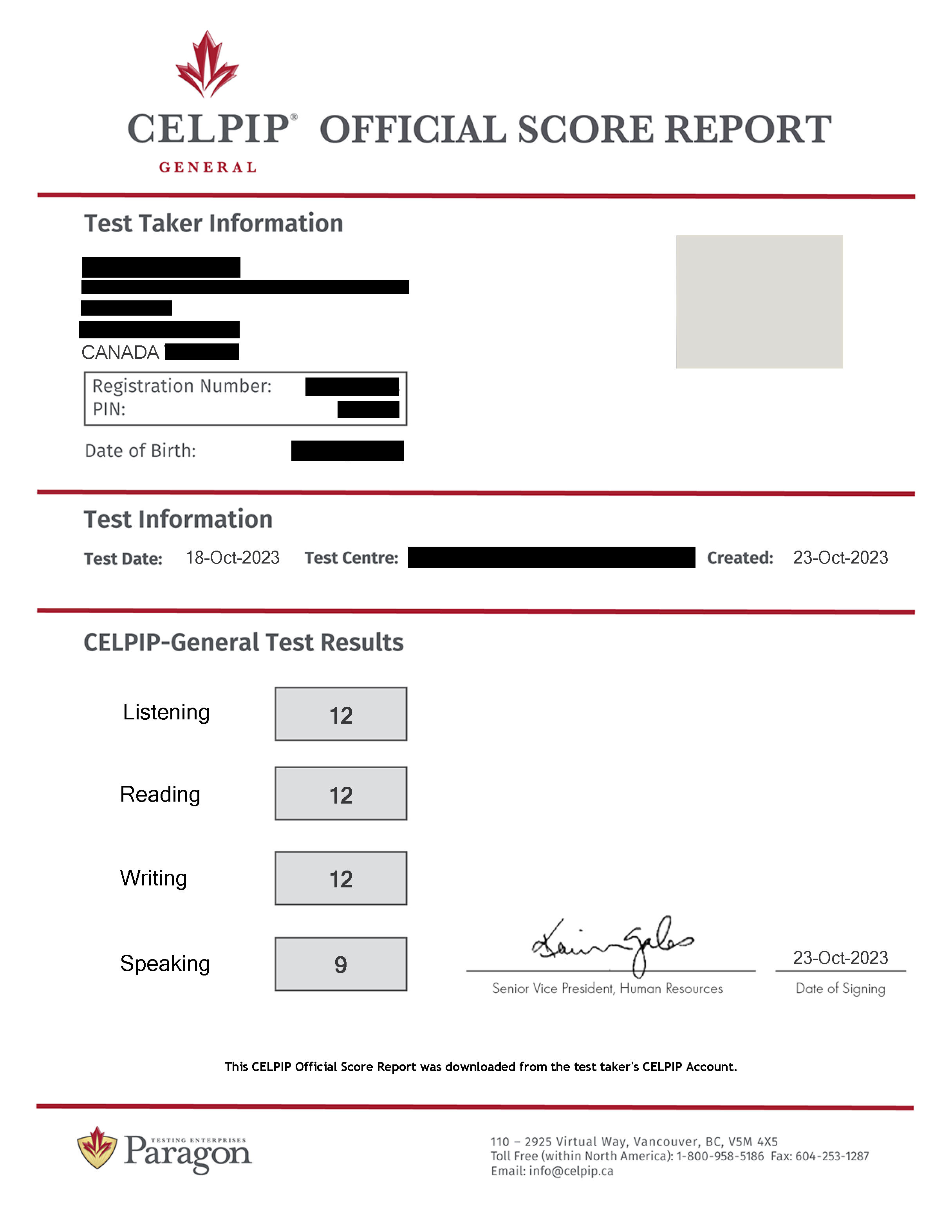 급하게 CELPIP을 봤는데 성적은 12, 12, 12, 9를 받았습니다. 성적표를 아래에 첨부했습니다. CELPIP의 장점은 점수가 빨리빨리 나온다는 것과 writing/speaking 점수를 매우 잘 준다는 것입니다. 솔직히 라이팅 12급, 스피킹 9급은 정말 언감생심이었는데 말이죠.
