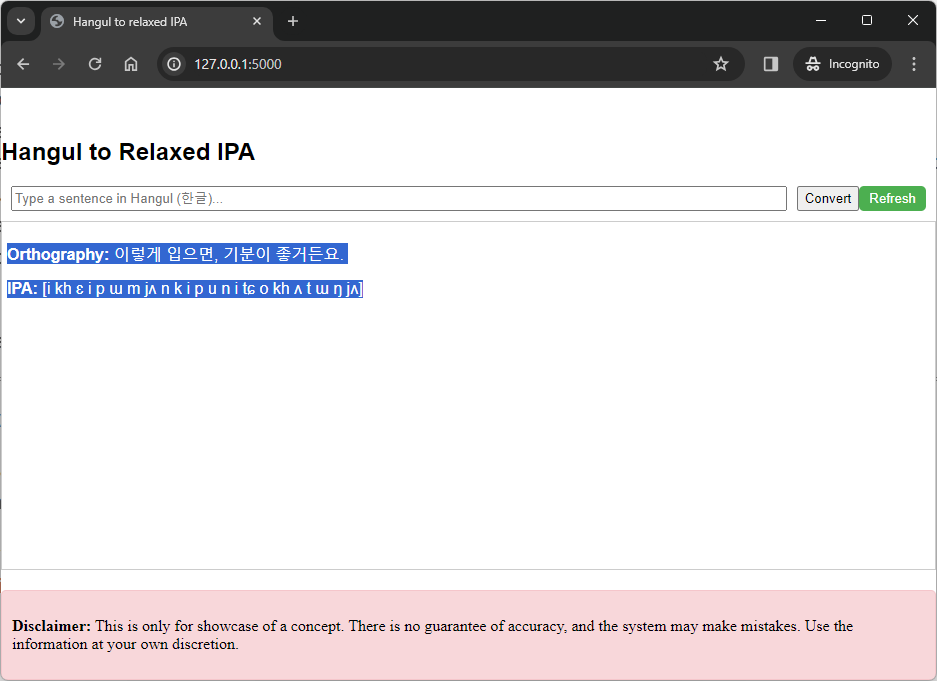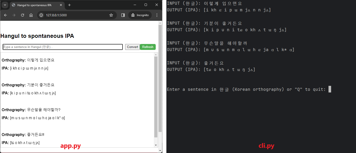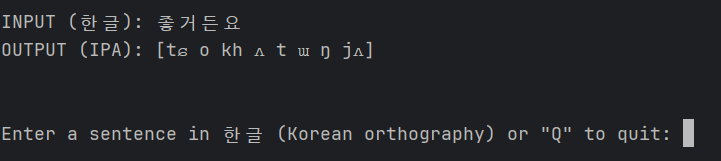 Command-line interface는 아예 터미널에서 앱을 처음 실행할 때 한국어 문장을 argument로 받을 수 있도록 했다. 즉, python cli.py [전사할 문장] 이런식으로 입력하면 바로 전사해준다. 아래 예시 그림 참조.