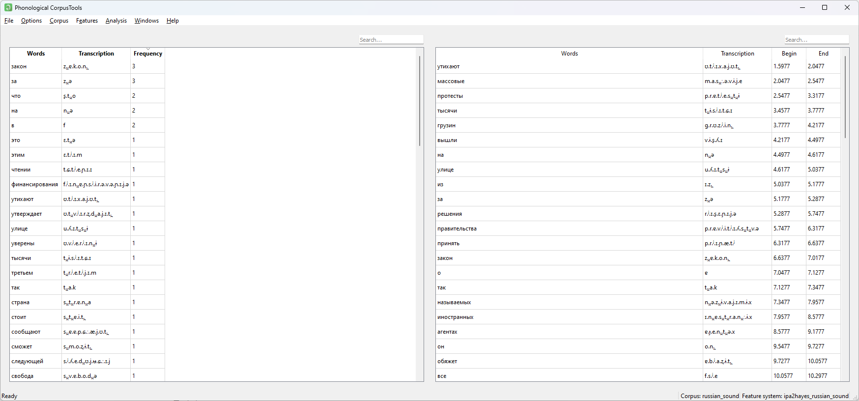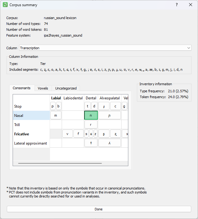 러시아어 코퍼스를 불러온 채로, Corpus > Summary를 누릅니다. Corpus summary 창에서, 음소표에 각 음소를 누르면 type frequency와 token frequency가 자동으로 나옵니다.