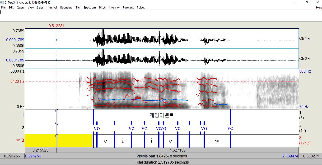 바로 아래에 있는 spectrogram + waveform은 동남방언 화자가 '게임이벤트'를 발음한 것이다.