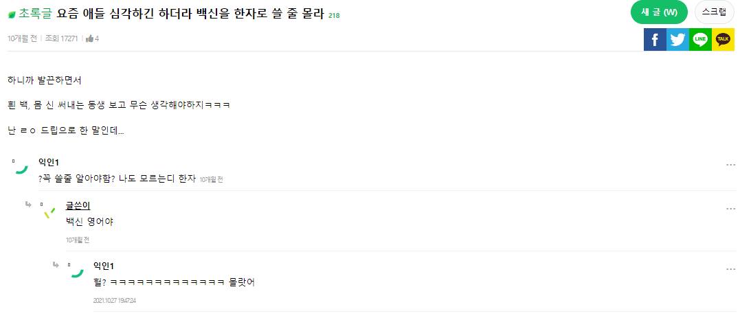 요즘 애들 심각하긴 하더라 백신을 한자로 쓸 줄 몰라 - 인스티즈(instiz) 일상 카테고리