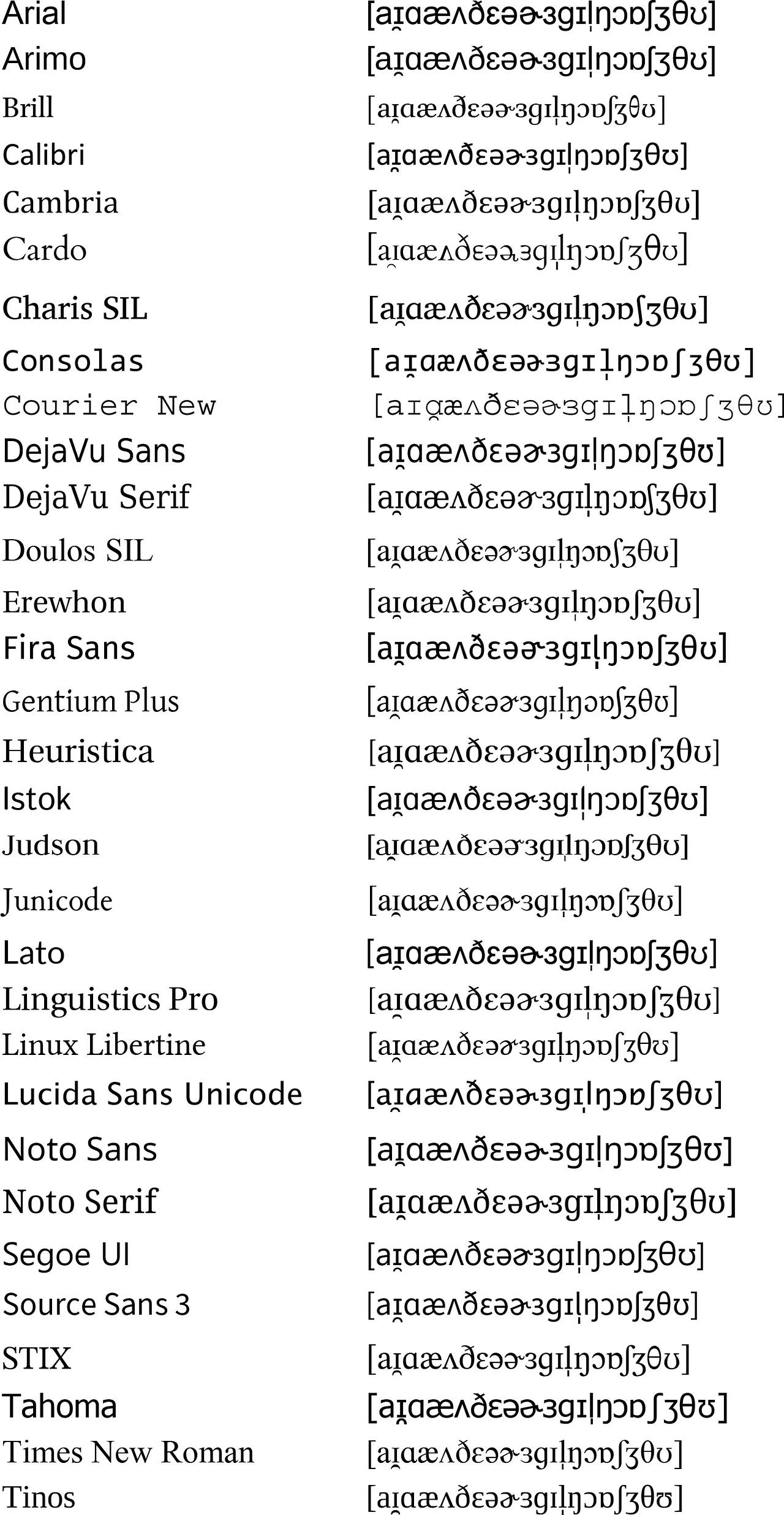 음운론에서는 아무래도 IPA에 포함된 온갖 기호를 쓰기 때문에 나는 폰트 고민이 무척 많다. 사실 오늘날에는 Arial이나 Times New Roman 같은 주요 폰트들은 IPA를 모두 커버하기 때문에 그냥 쓰면 대체로 왠만큼 제대로 표현된다.