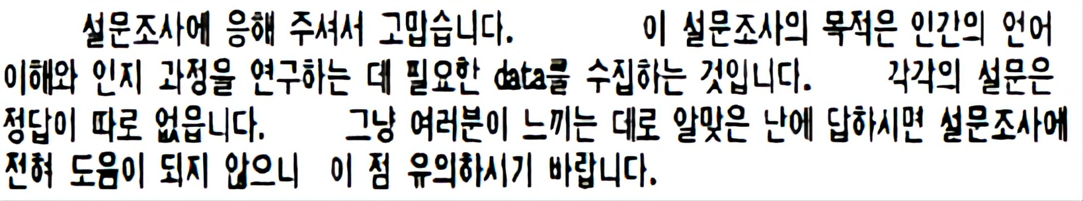 "설문조사에 응해 주셔서 고맙습니다. 이 설문조사의 목적은 인간의 언어 이해와 인지 과정을 연구하는 데 필요한 data를 수집하는 것입니다. 각각의 설문은 정답이 따로 없읍니다. 그냥 여러분이 느끼는 대로 알맞은 난에 답하시면 설문조사에 전혀 도움이 되지 않으니(???) 이 점 유의하시기 바랍니다"
