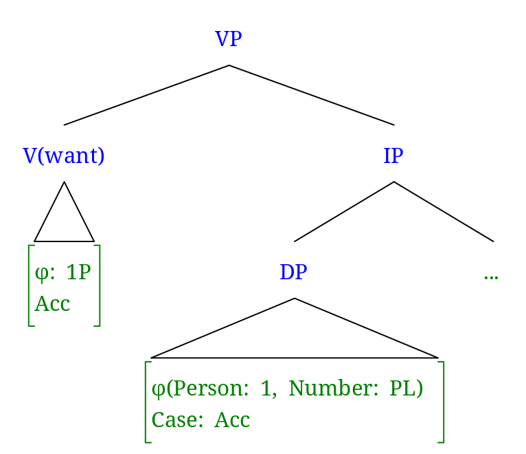 그리고 want의 자질 중엔 [Acc] 자질이 있는데 이건 Case자질에 값을 부여한다. 그런데 φ자질(person, number, gender...)들의 값이 '안정해짐' 이다. [uφ] 라고 쓰자. (오개념인 것 알지만 여기선 설명을 간단히 하기 위해 이렇게 썼습니다. 엄밀히 V: want 그자체가 아니라 v 의 자질도 포함해요. 그러니 제발 뒤에서 숨어서 욕하지 마세요 굽신굽신...🙇 )