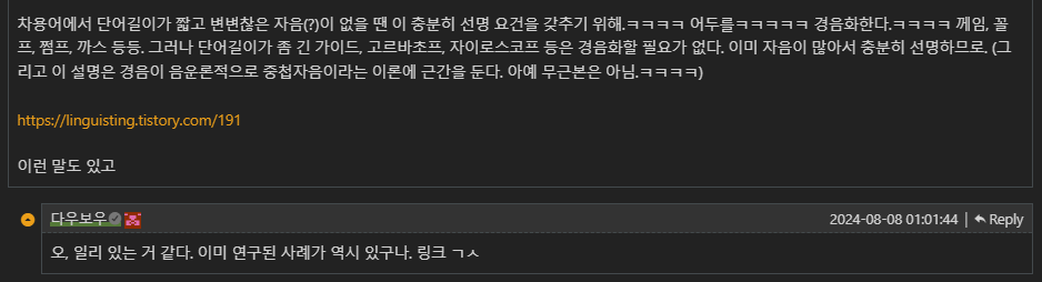 사실 [어떤 커뮤니티에 인용된 내 블로그 글]를 보고 식겁했다. 나는 농담으로 "단어길이가 짧고 변변찮은 자음(?)이 없을 땐 이 충분히 선명 요건을 갖추기 위해.ㅋㅋㅋㅋ 어두를ㅋㅋㅋㅋㅋ 경음화한다.ㅋㅋㅋㅋ " 라고 적었는데, 이걸 진담으로 받아들이면서 "오 이미 연구된 사례가 있구나" 라고 반응하는 걸 보고 약간 충격을 받았다.