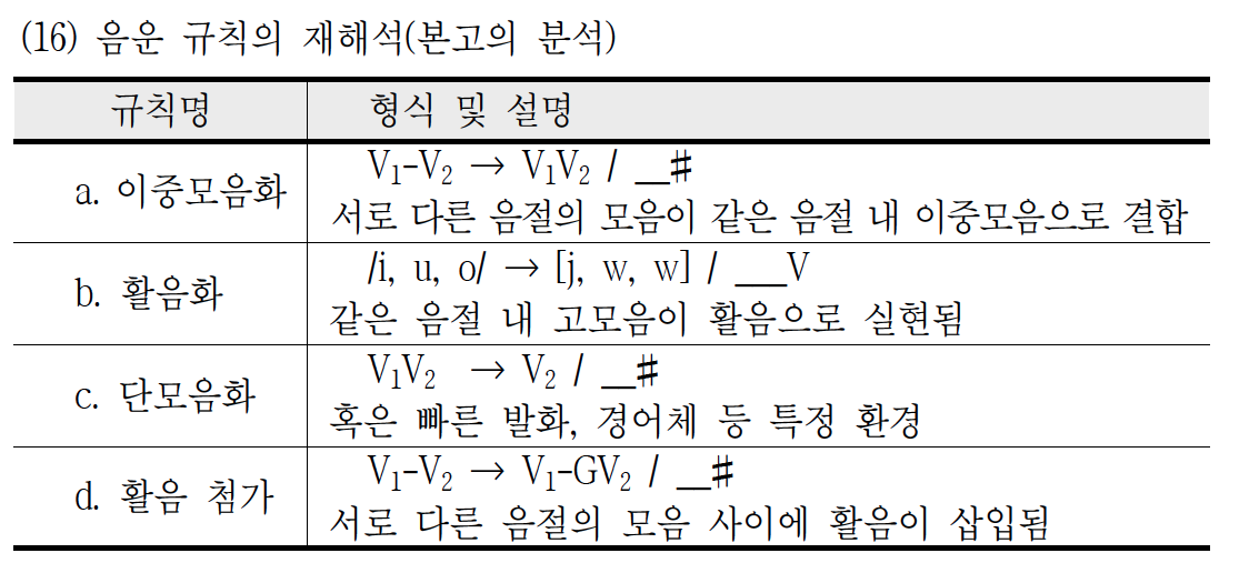 - [j] 계열 이중모음의 활음 [j]는 기저에서 /i/이다. 따라서 [ja] [jɛ]는 /ia/ /iɛ/로 표상된다.