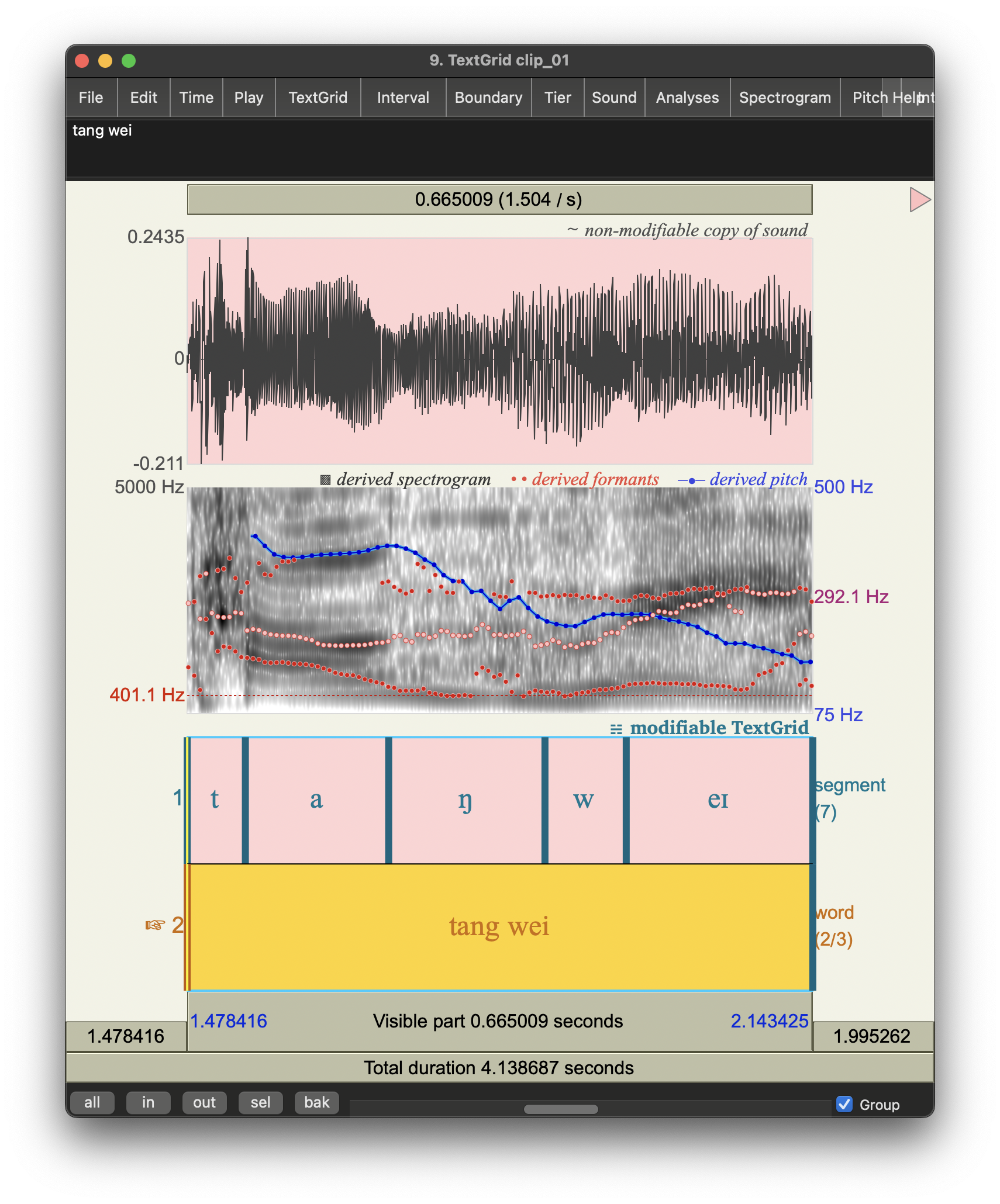 각각 (1) - (8) 로 번호를 붙여보았는데, 각각의 발화를 추출해서 원본 동영상(컷편집만 해서)은 아래 "접은 글"로 달아놓았고, Praat 분석을 위한 소리를 mono 16 kHz로 다운샘플링해서 TextGrid와 함께 아래 tangwei.Collection으로 첨부했다. 굳이 프랏으로 직접 분석해볼 생각이 없는 사람들은 아래 '접은 글'을 펴서 읽으면 되겠다.