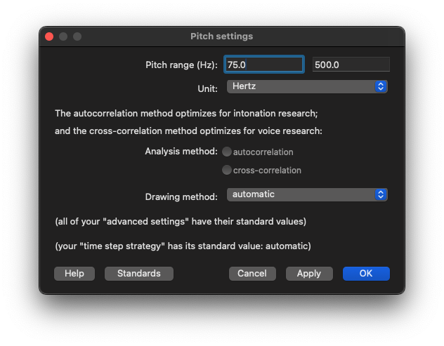 아참, Pitch tracking 세팅은 아래와 같이 praat 기본 세팅이다.