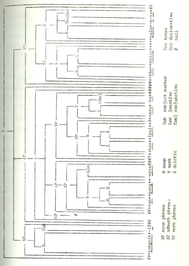 이렇게 나와준 후에 각각의 괄호로 묶인 단위가 어떤 범주값을 부여받게 된다. [ðis]는 determiner 아니면 noun, [ɪz]는 verb 아니면 copula, [tu]는 adverb, [dɪfɪkəlt]는 adjective, [[tu][dɪfɪkəlt]]는 AdjP, 이런식으로...