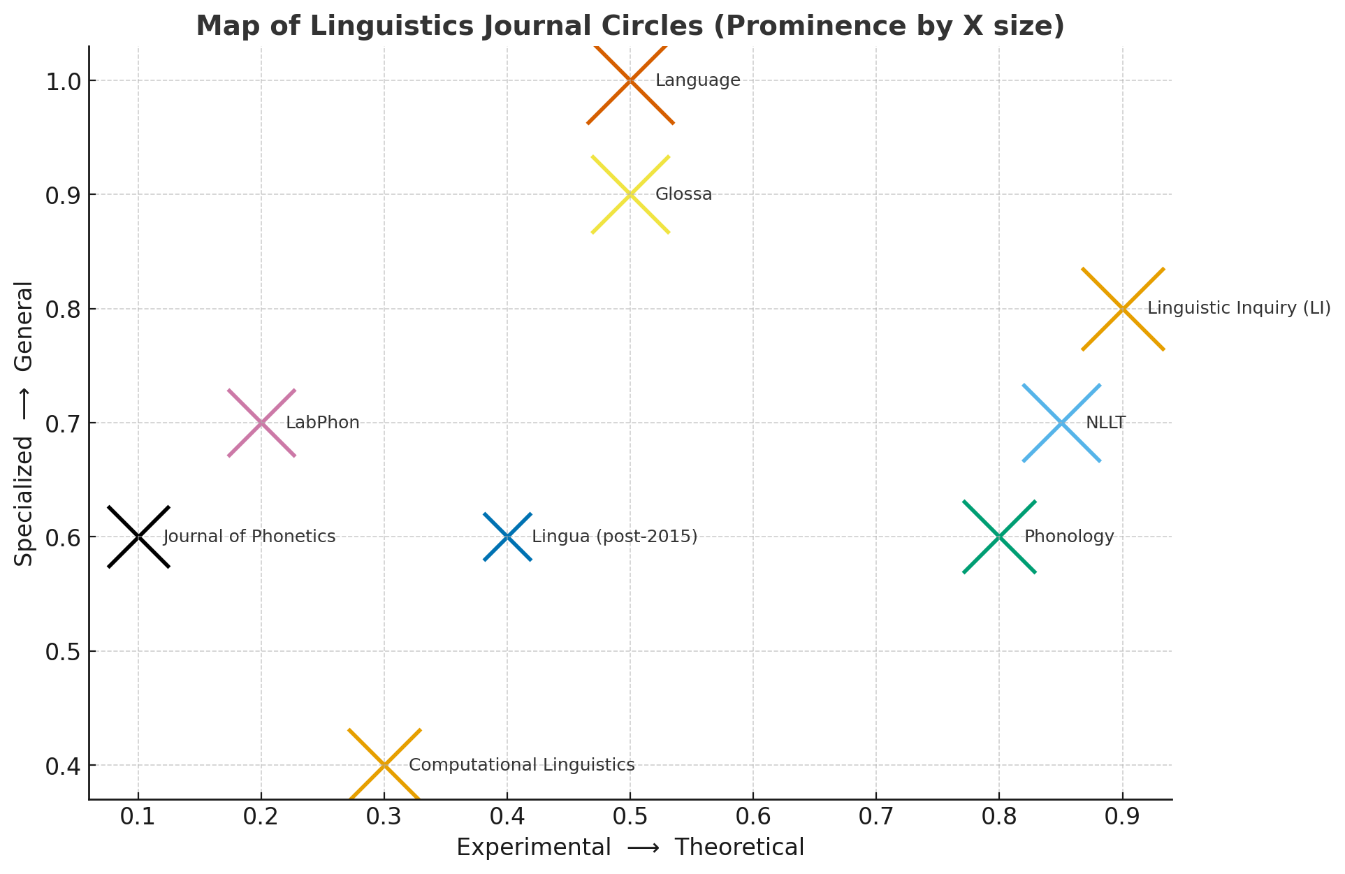 우선 x축은 '이론언어학 척도.' 오른쪽으로 갈수록 이론적인 논문을 선호한다. 그리고 y축은 아래로 갈수록 특정 분과/프레임워크 한정, 위로갈수록 보편적인 저널. 마지막으로 X 표시의 크기는 저명성? 유명한 정도? 할튼 얼마나 좋은 저널인가 그런걸 표시한다.