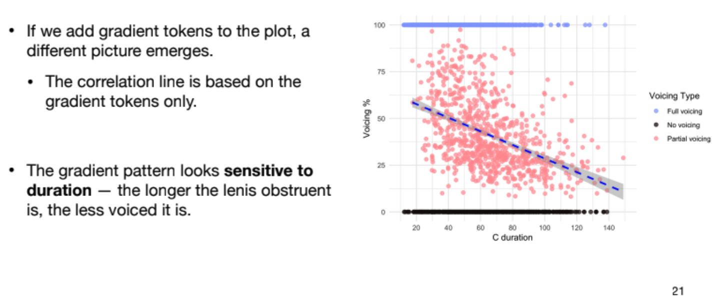 이외에도 다른 implications도 있었다. gradient한 부분과 categorical한 부분을 나누어 gradient 한 부분은 duration factor (아마도 phonetic)로, categorical한 부분은 음운론적으로 분석한 것같다.