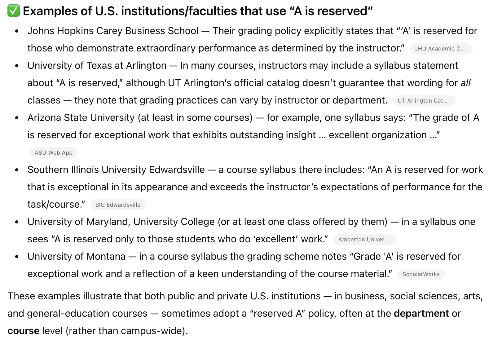 이건 내가 지금 학교에서 과정생 생활을 시작하면서 가장 컬쳐쇼크를 받은 것인데, A를 안 준다. 채점표(rubric)에도 B+ 맞는 답안의 특징 정도까지만 적혀있고 A는 평가자가 생각하지 못한 것을 다루어야 받는다 (go above and beyond 라고 한다).