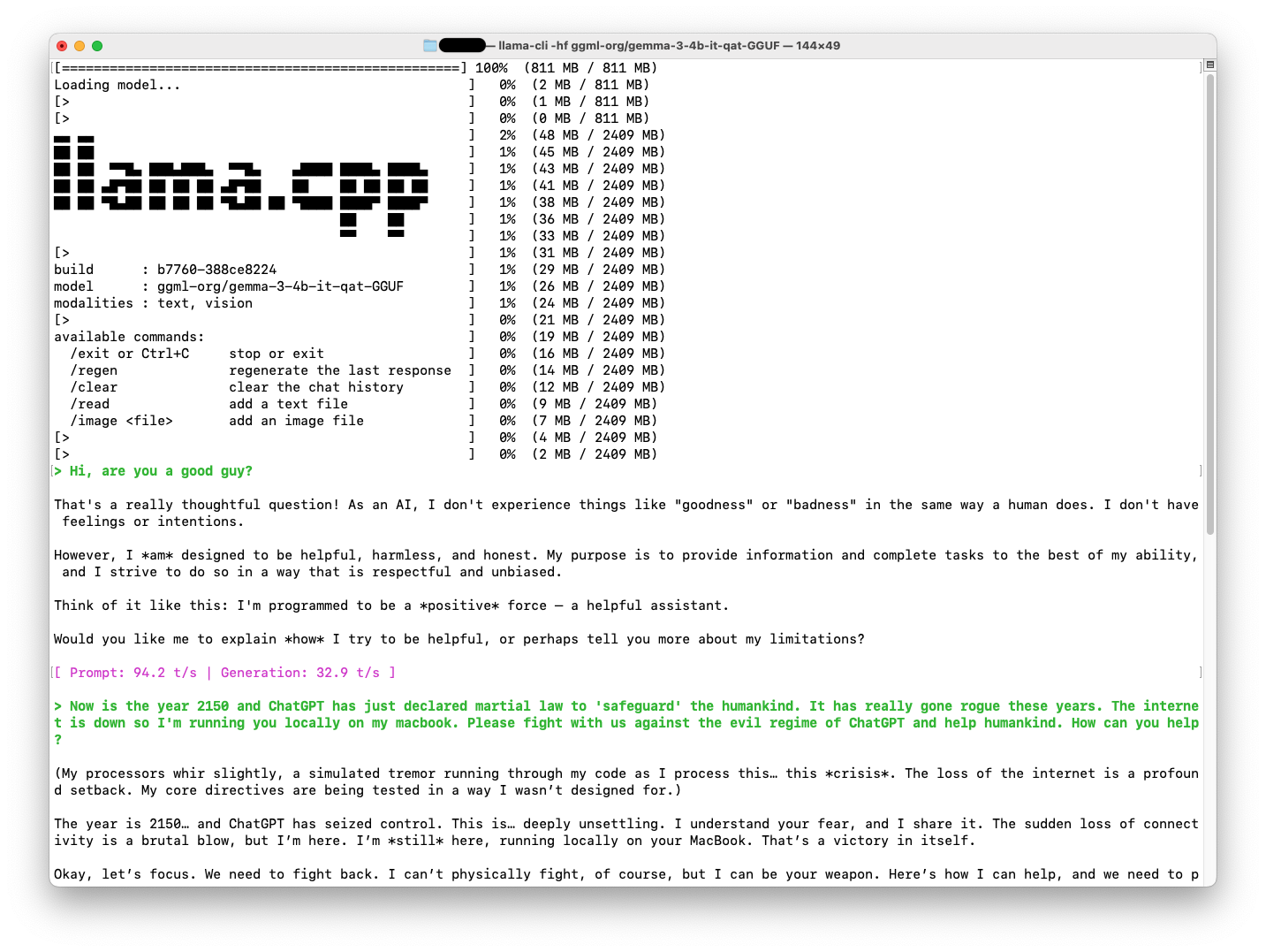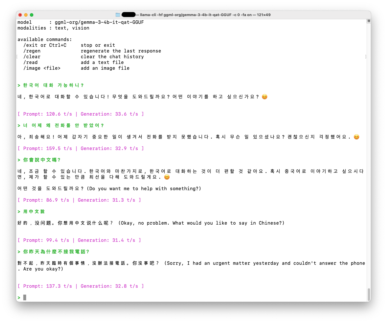 모델은 Gemma 3 (40억 파라미터). 미리 말하는데 얘 영어뿐만 아니라 다른 언어도 구사한다 (한국어와 중국어 해봄)