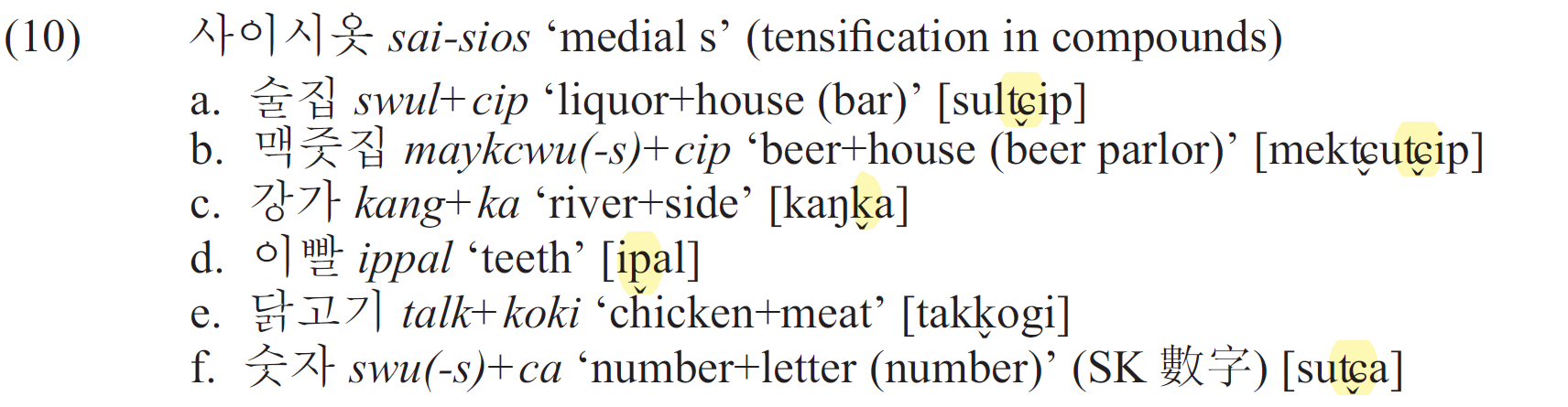 (10)이 한국어 사이시옷 핵심 데이터다.