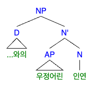이마저도 선형적으로만 나란히 나타날 뿐 구조는 [의 [[우정 어리]-ㄴ 인연]]이다. 즉, 아래 그림과 같이 "...와의 인연, 그런데 우정어린"(ㅋㅋㅋ)의 구조이다.