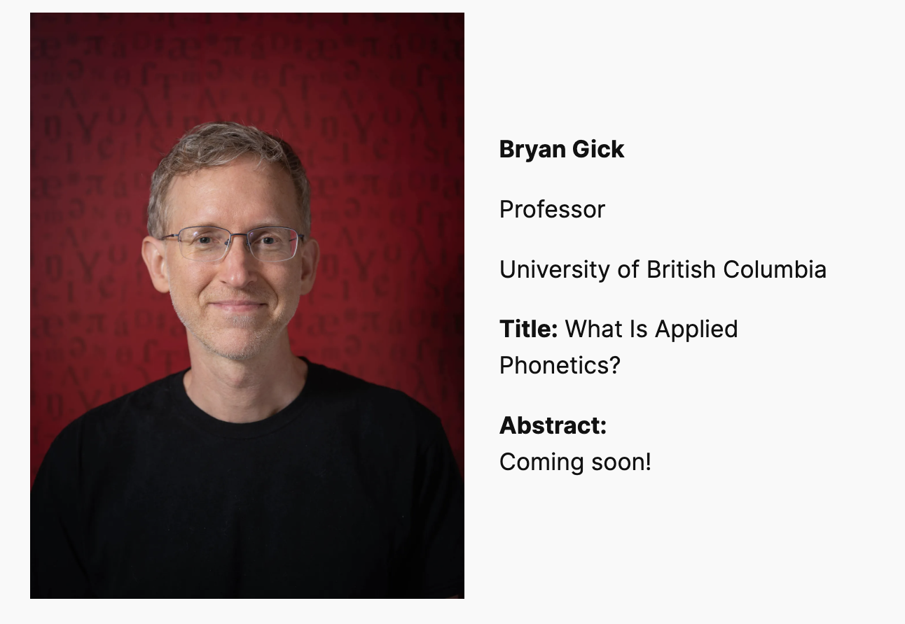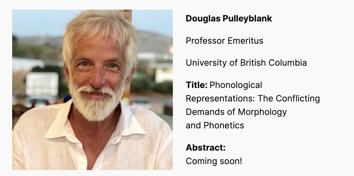자질론의 Jeff Mielke, 최적성이론의 Doug Pulleyblank, "조음음성학" 그자체인 Bryan Gick 무슨 어벤저스도 아니고 도대체 어떻게 한자리에 모을 생각을 한걸까. 이런 학회는 누가 기획하기에 가능한 건지 매우 칭찬해.