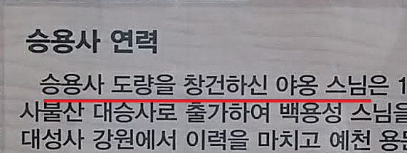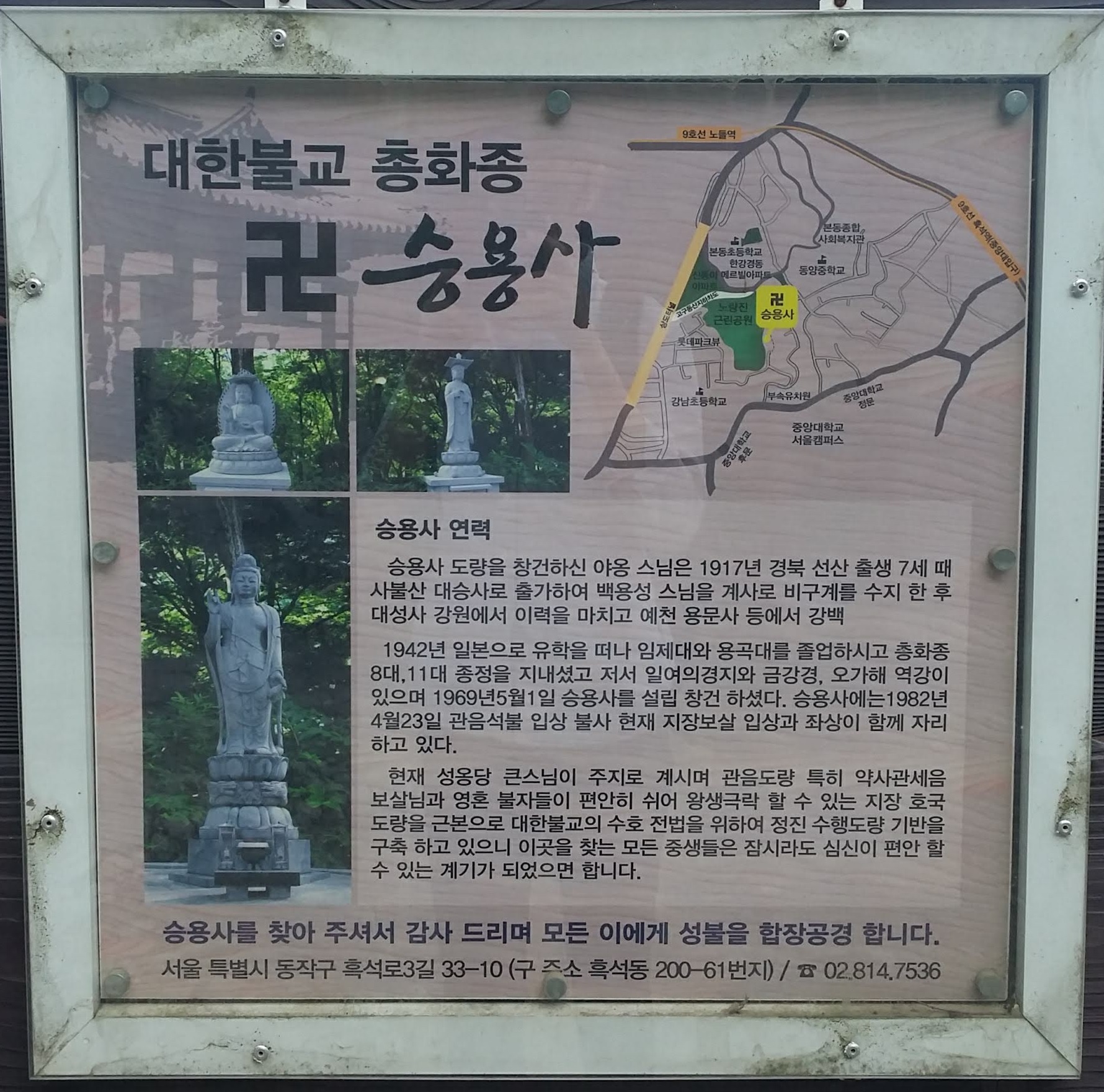 서울 동작구 상도동에 있는 승용사를 창건한 스님은 법명이 야옹 이라고 한다. 위에 내가 찍은 승용사 안내 표지판에서 볼 수 있듯이 야옹스님은 1969년 승용사를 설립 창건하였다고 한다.