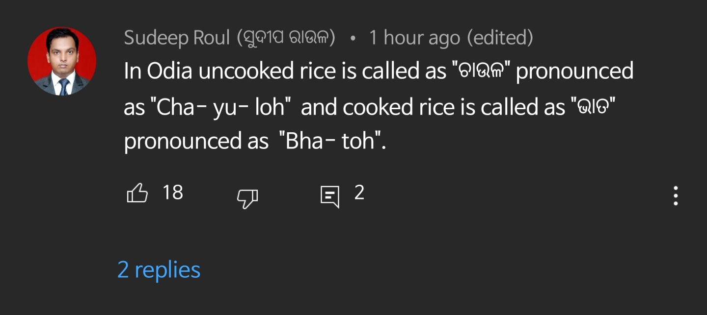 - Odia (Indo-Iranian, Indo-Aryan): ଚାଉଳ [tʃaː.u.ɭɔ] - ଭାତ [bʱaː.tɔ]