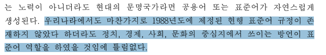 "현대의 문명국가라면 공용어 또는 표준어가 자연스럽게 생성된다. (...) 표준어 규정이 존재하지 않았다 하더라도 (...) 중심지에서 쓰이는 방언이 표준어 역할을 하였을 것임에 틀림없다." 정말 그러하다. '국립국어대사전'과 한국어 렉시콘은 동치가 될 수 없고, '표준어규정'은 한국어 문법이 아니다. 한국어는 '국립국어대사전'에 수록된 단어를 '표준어규정'에 따라 조합하는 방식으로 작동하지 않는다.