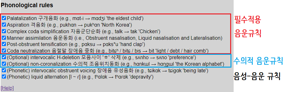 사실 이것은 내가 석사때인 2016년에 짰던 R코드를 기초로 약간 손보고 웹 유저 인터페이스를 입힌 것이다. 그것은 형태론적으로 단순한 어휘목록에 음운규칙을 아주 단순히 (아주 SPE적인 수준에서) 적용하는 기계였다. 강범모 김흥규 2009 [책링크] 한국어 어휘목록을 집어넣으면 규칙적용형(논리적 표면형)이 나오는 방식이었다.