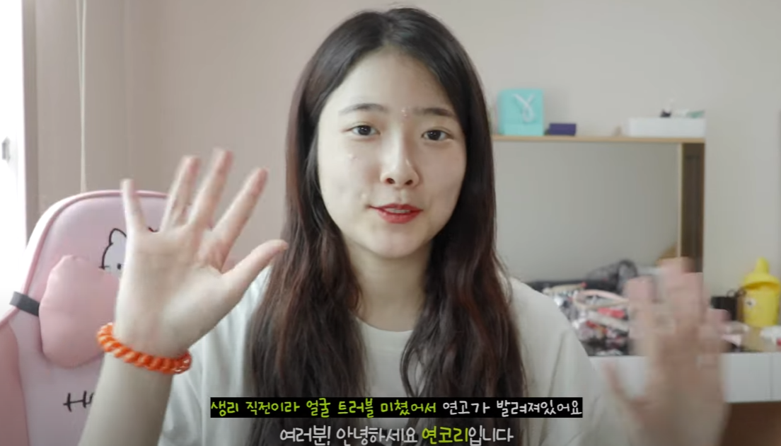 아래의 스크린캡처는 위 유튜브 영상의 가장 처음 부분에 나오는 것입니다. "생리 직전이라 얼굴 트러블 미쳤어서 연고가 발려져있어요" 라는 코멘트가 자막에 달려있습니다. 입말로 하는 것이 아니기 때문에 충분한 계획을 거쳐 삽입된 자막으로 보입니다. 그런데 해당 자막에서 선어말어미 '-었', '-지', 등은 통사론/음운론적 기능을 하지 않는 것으로 보입니다. 따라서 아마도 화용론적 이유에서 삽입된 것으로 여겨집니다.