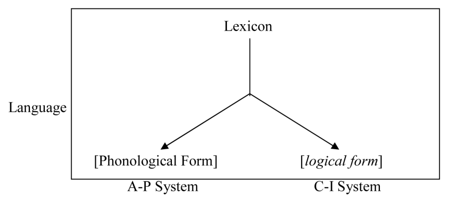 형식주의 언어학의 큰 전제 중 하나는 연산부로서의 '문법'(grammar)과 저장부로서의 '어휘부'(lexicon)의 구분이다. 자연언어모델은 어휘부로부터 연산가능단위를 가져다가 문법(그것이 제약군이 되었건 규칙군이 되었건)으로 연산한다는 것이 큰 그림이다. 마치 컴퓨터가 RAM이나 HDD SSD등의 메모리에서 정보를 인출하여 CPU나 GPU로 연산을 하는 것과 동일한 모델이다. Chomsky (1981)1 이후 아래와 같이 표준적인 Y-Model로 표현한다.