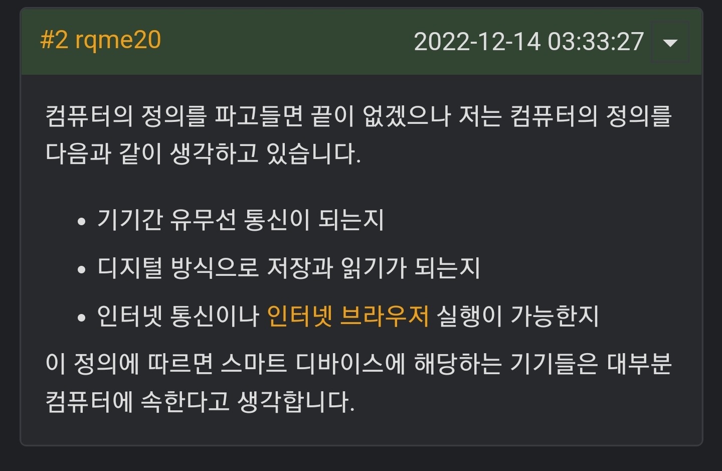 (여담으로 아래 스크린캡처에서와 같이 오늘날 어린 친구들은 컴퓨터를 '저장공간이 있는 통신기기' 정도로 생각하는 모양인데 computer가 compute-er 즉 연산하는 기계라는 점을 생각해보면 격세지감이다. 당연히 컴퓨터의 핵심에 연산을 놓는 내가 그냥 노땅인 것일까.. 연산기능이 없는 단순 저장장치가 과연 컴퓨터인지를 별도로 논의해주어야 하는 시대가 오고 있다. 원본링크는 여기)