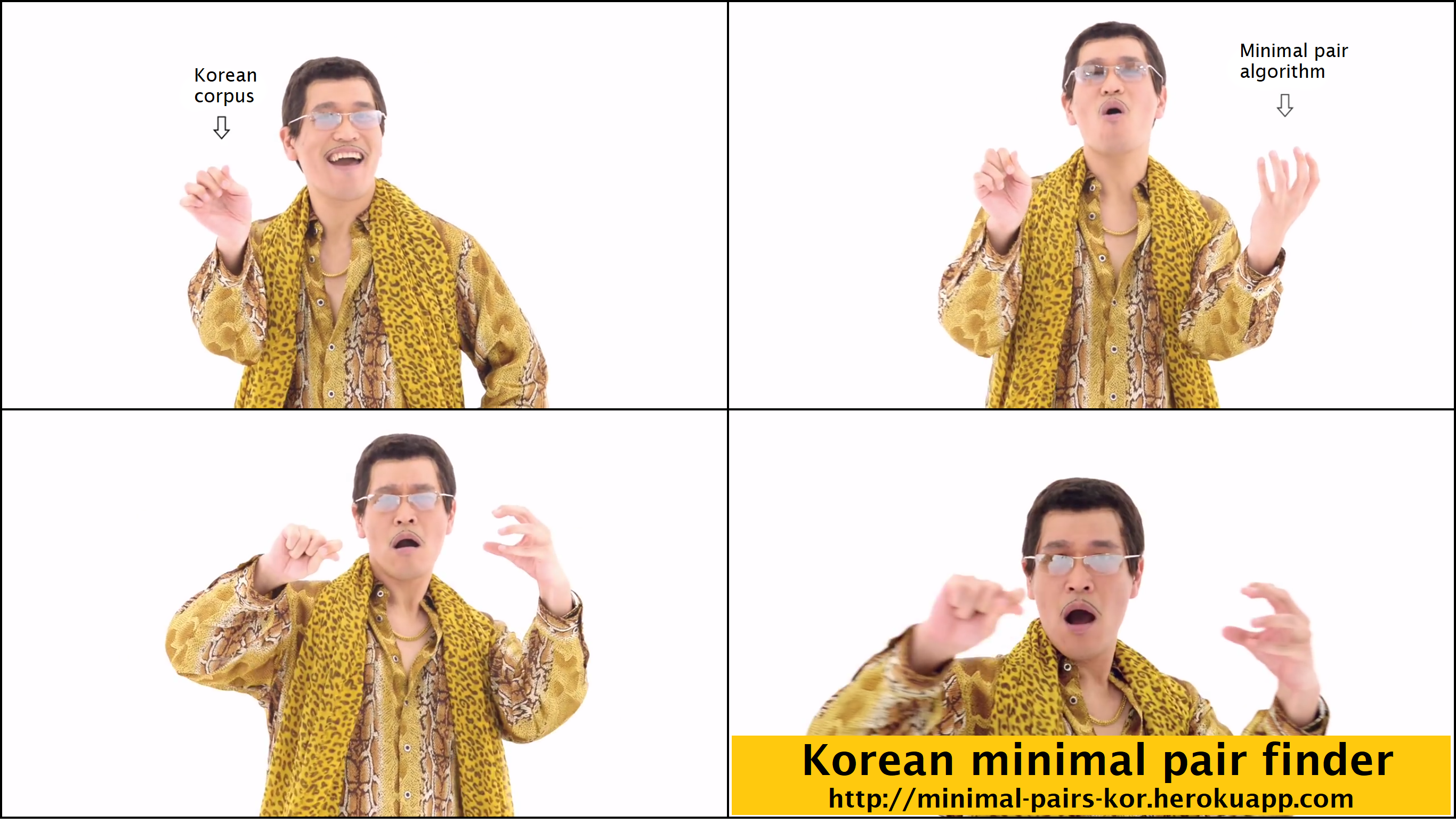 - 이 앱의 이름은 뭐로 해야 하지? Hangul to IPA 같이 짧으면서도 직관적인 이름이 있으면 좋겠는데 Korean minimal pair finder라는 working title은 너무 지루하다.