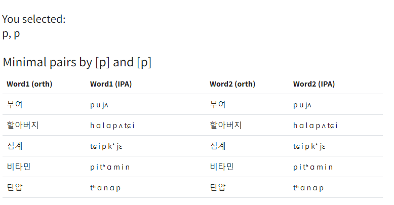 음소 2개를 선택하면 자동으로 한국어 최소대립쌍 찾아주는 웹앱입니다. 많은관심부탁드립니다.