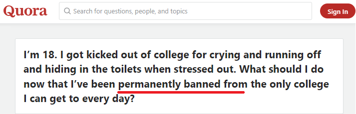 아래 quora 질문에서, 퇴학을 당했다는 표현을 paraphrasing하면서 kicked out 이라고 썼다가 다음엔 "banned from the college"라는 표현을 사용했다. 이건 무슨 트위치 채널에서 밴 당한 것도 아니고, 퇴학을 이런식으로 표현할까 싶었다. 낯설면서도 한편으로는 재미있었다.